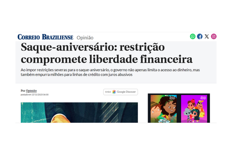 O Correio Braziliense publicou artigo assinado por Paulo Solmucci que ele critica as novas regras impostas pelo governo federal ao saque-aniversário do FGTS. Para Solmucci, as mudanças que limitam a antecipação a R$ 2.500 por ano e impõem intervalo mínimo de 90 dias para liberação representam um retrocesso na liberdade financeira dos trabalhadores, especialmente os de baixa renda, que são os principais usuários da modalidade.